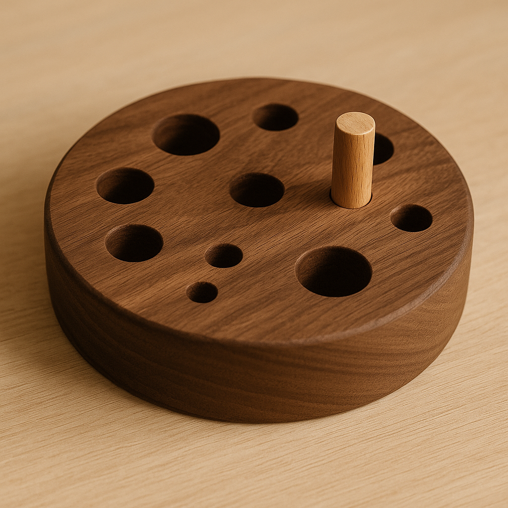 A solid block of wood, carved with shallow wells and fitted with smooth dowel pegs.